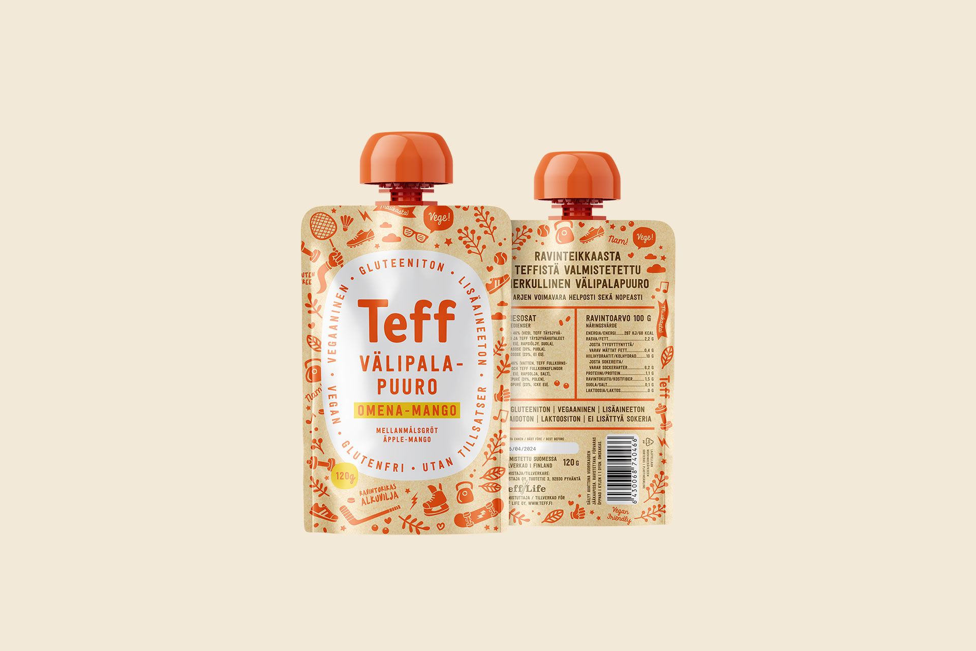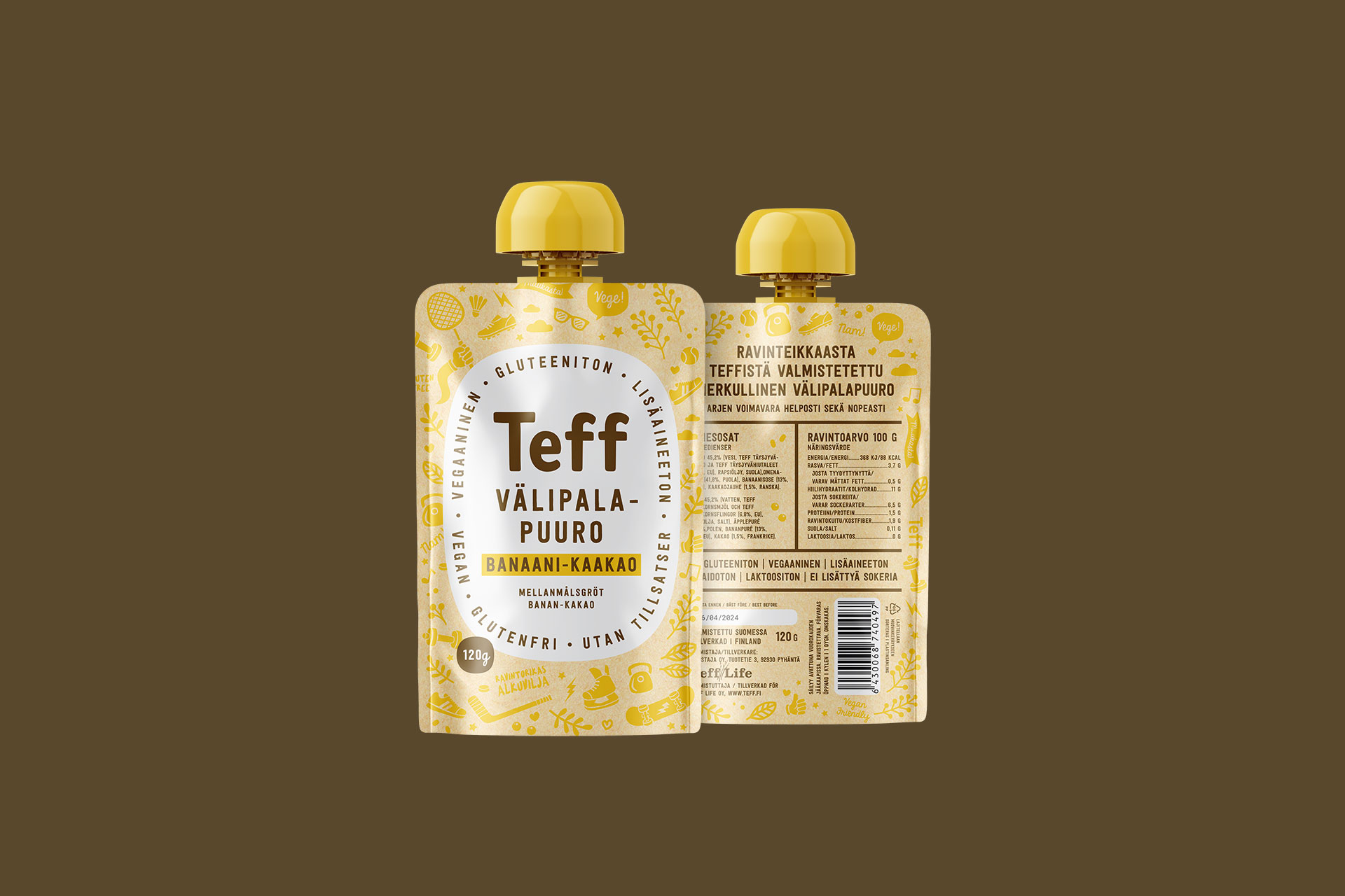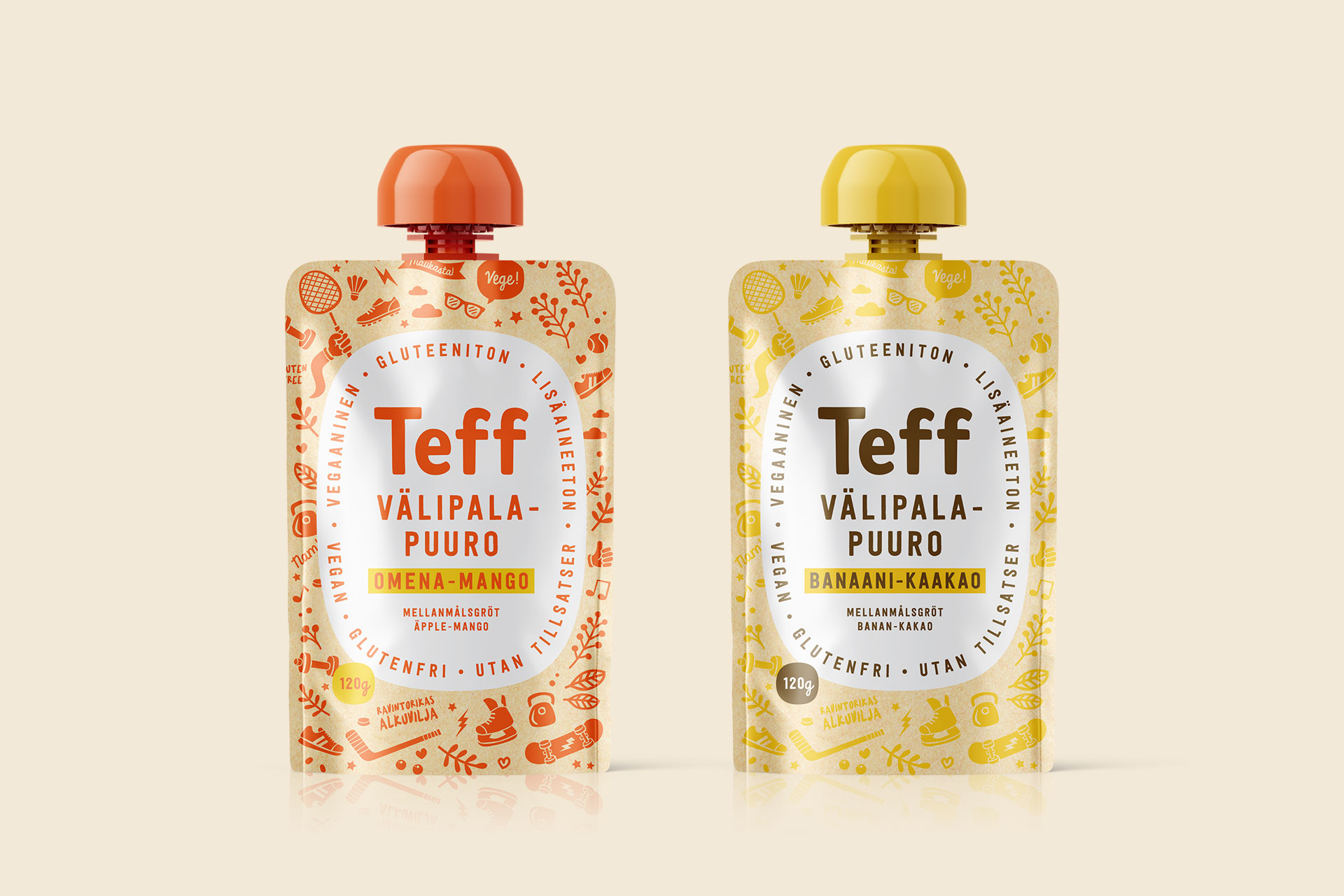 Tuotepakkauksien suunnittelu teff viljasta valmistetuille välipalapuuroille 2023. Tutustu gluteenittomiin välipalapuuroihin teff.fi