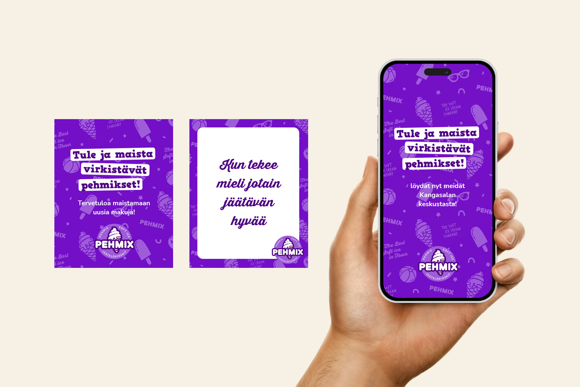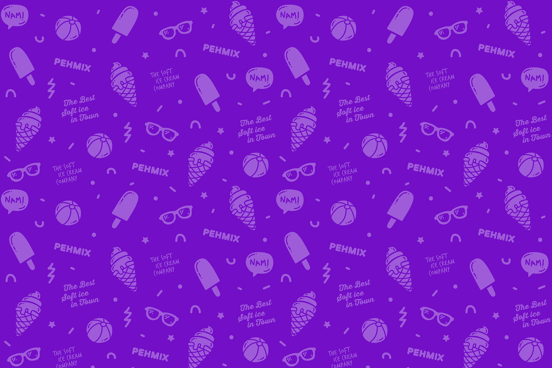 Pehmix brändin ilmeen suunnittelu. Logo, kuosi, kioskin teippaukset, painotuotteet, some-materiaalt. | 2025